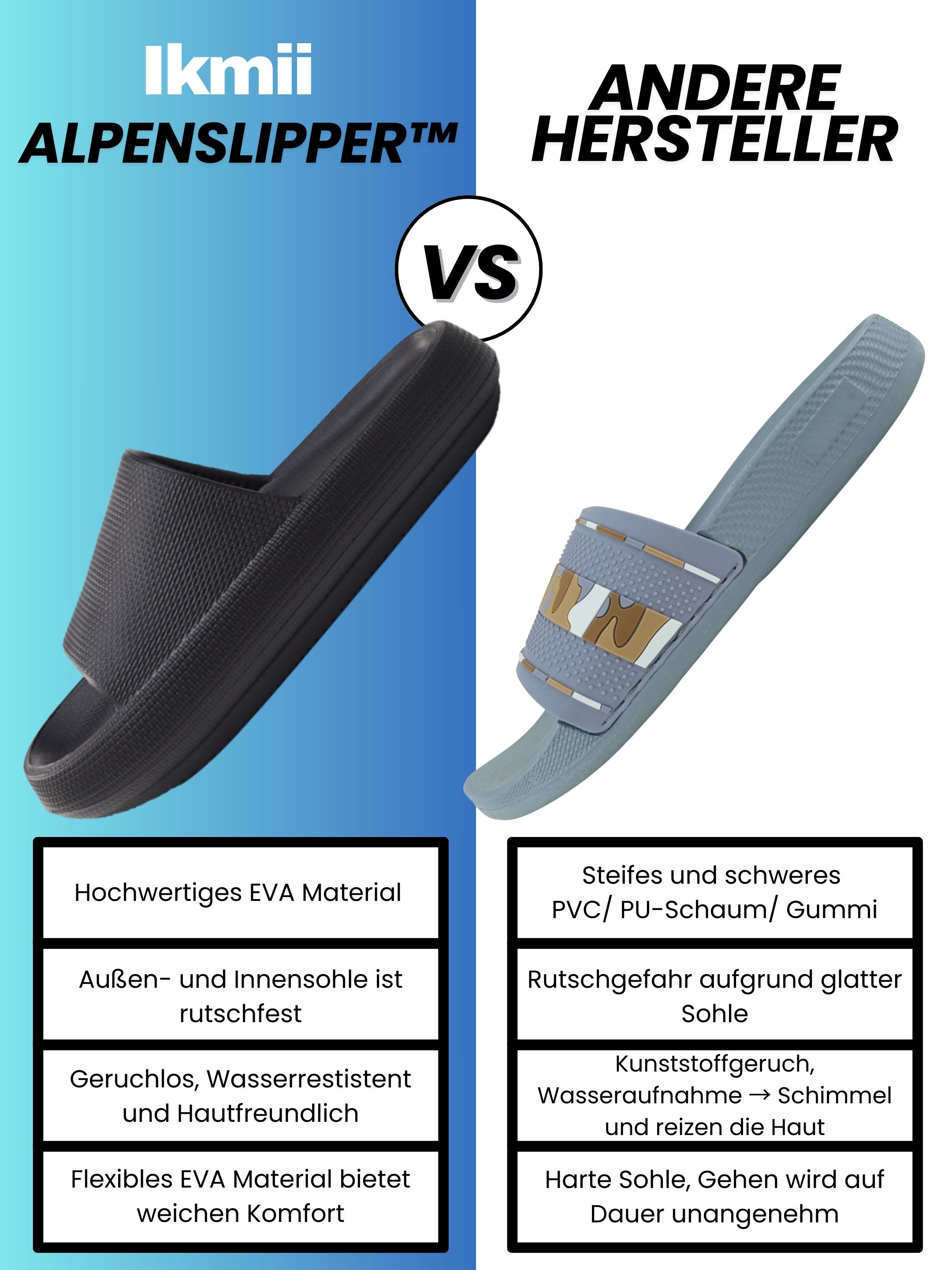 Die Alpenslipper™ bestehen zu 100% aus hochwertigem EVA Material. Dieses ist besonders leicht, flexibel, stoßdämpfend und wasserresistent – ideal für maximalen Komfort im Alltag.