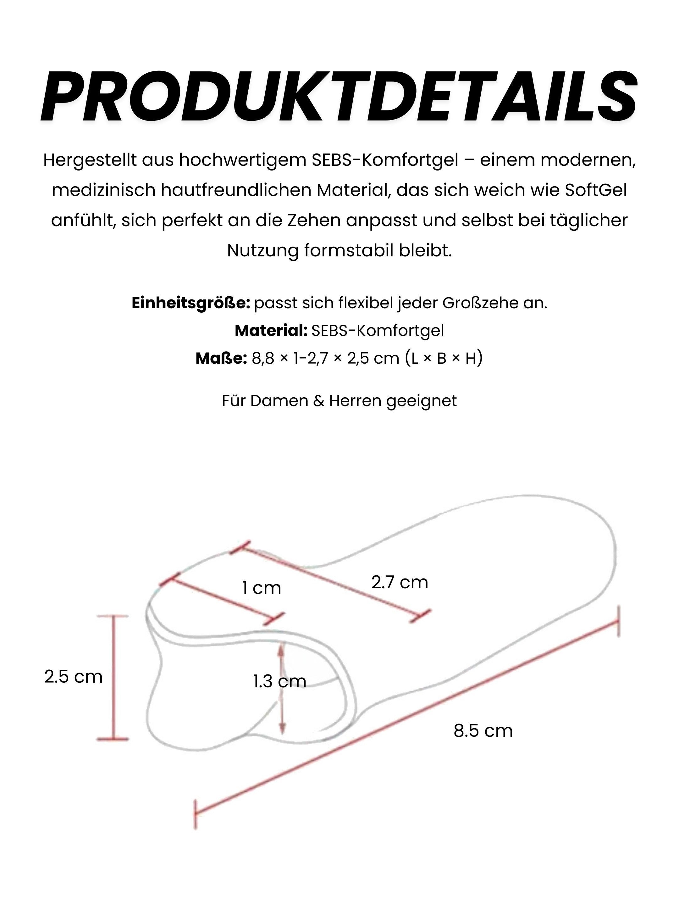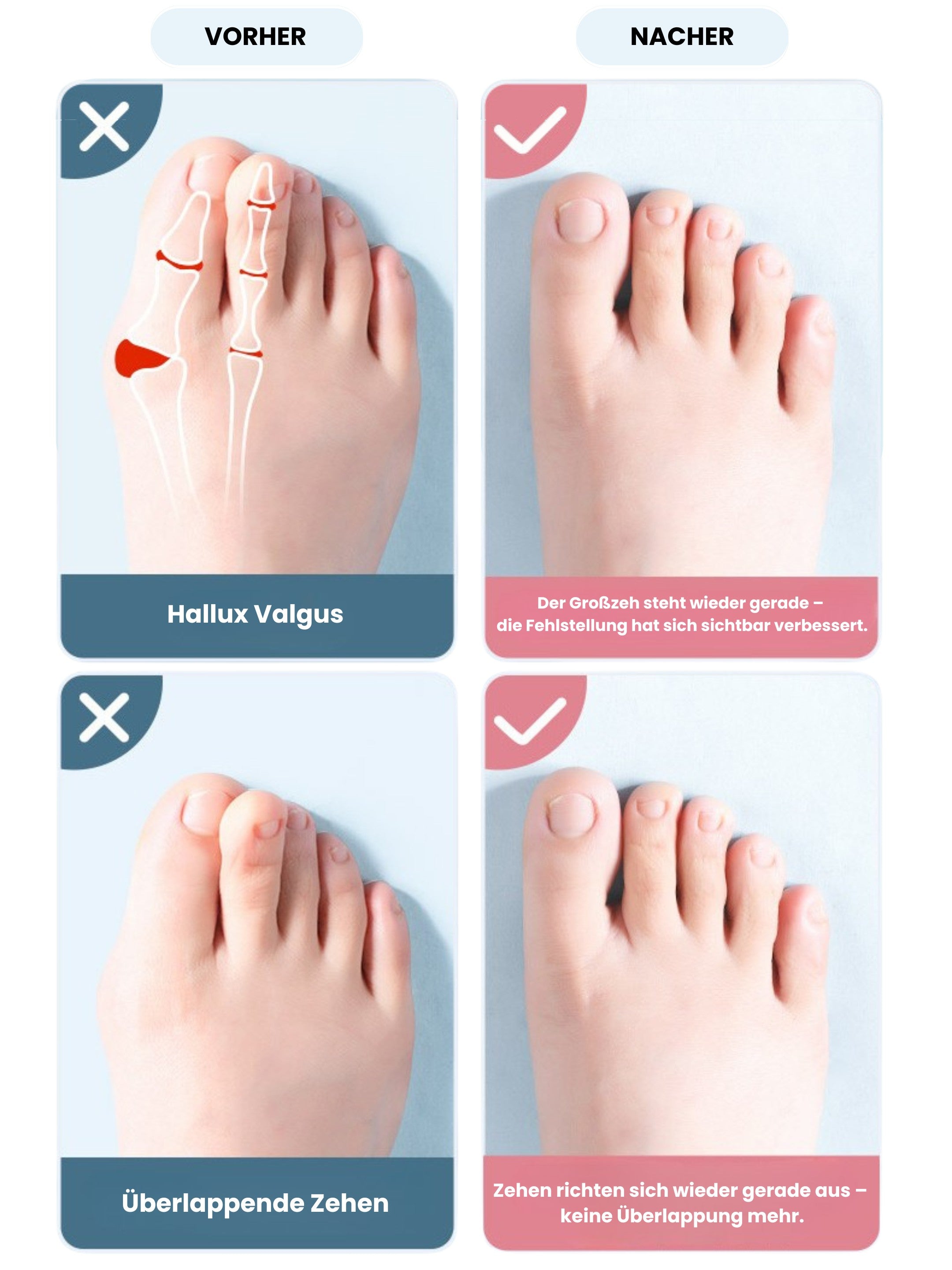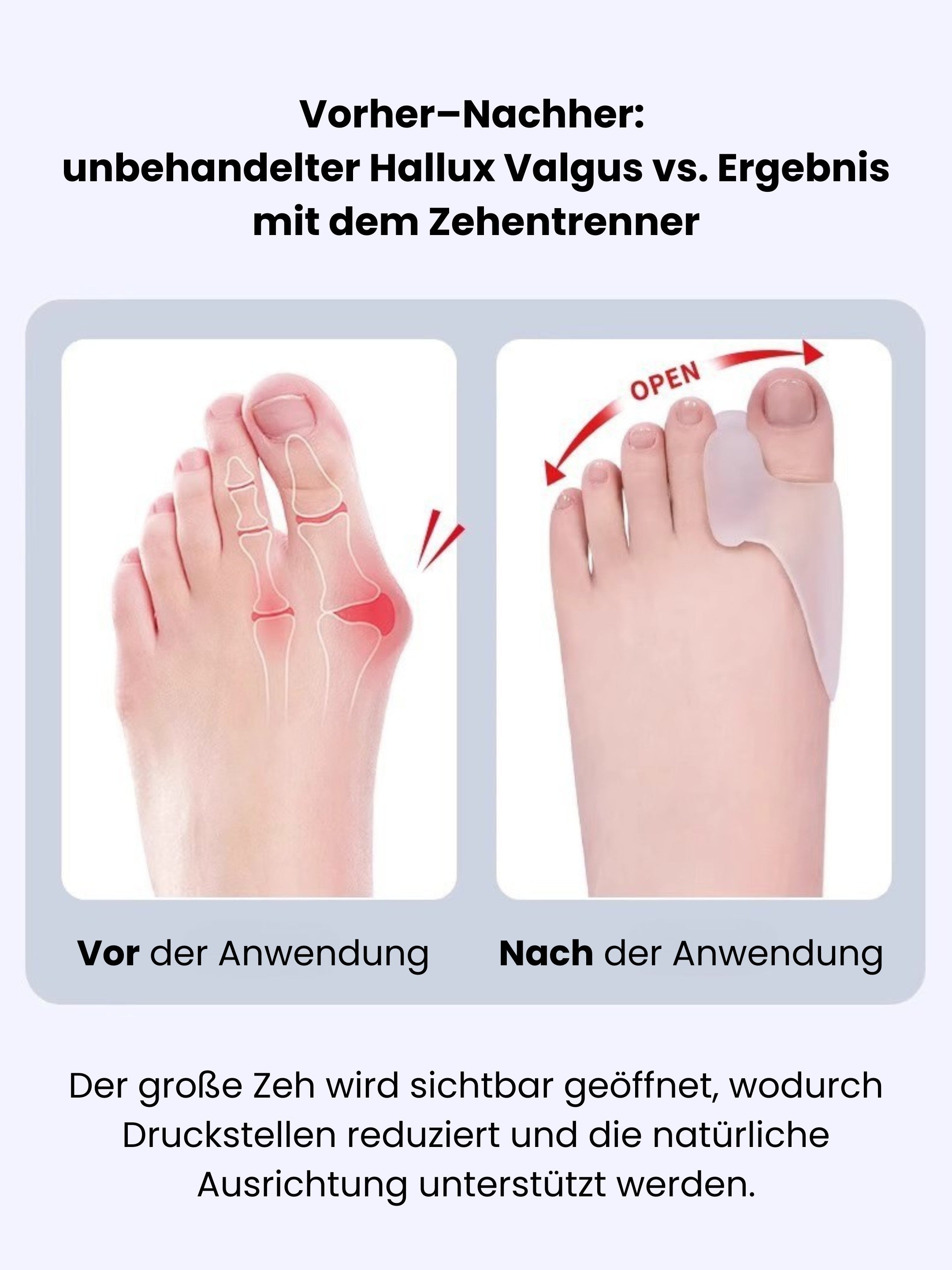 Sie schaffen mehr Abstand zwischen den Zehen, richten diese sanft aus und reduzieren Druck sowie Reibung. Dadurch können Schmerzen gelindert, Fehlstellungen entlastet und die Fußmuskulatur aktiviert werden.